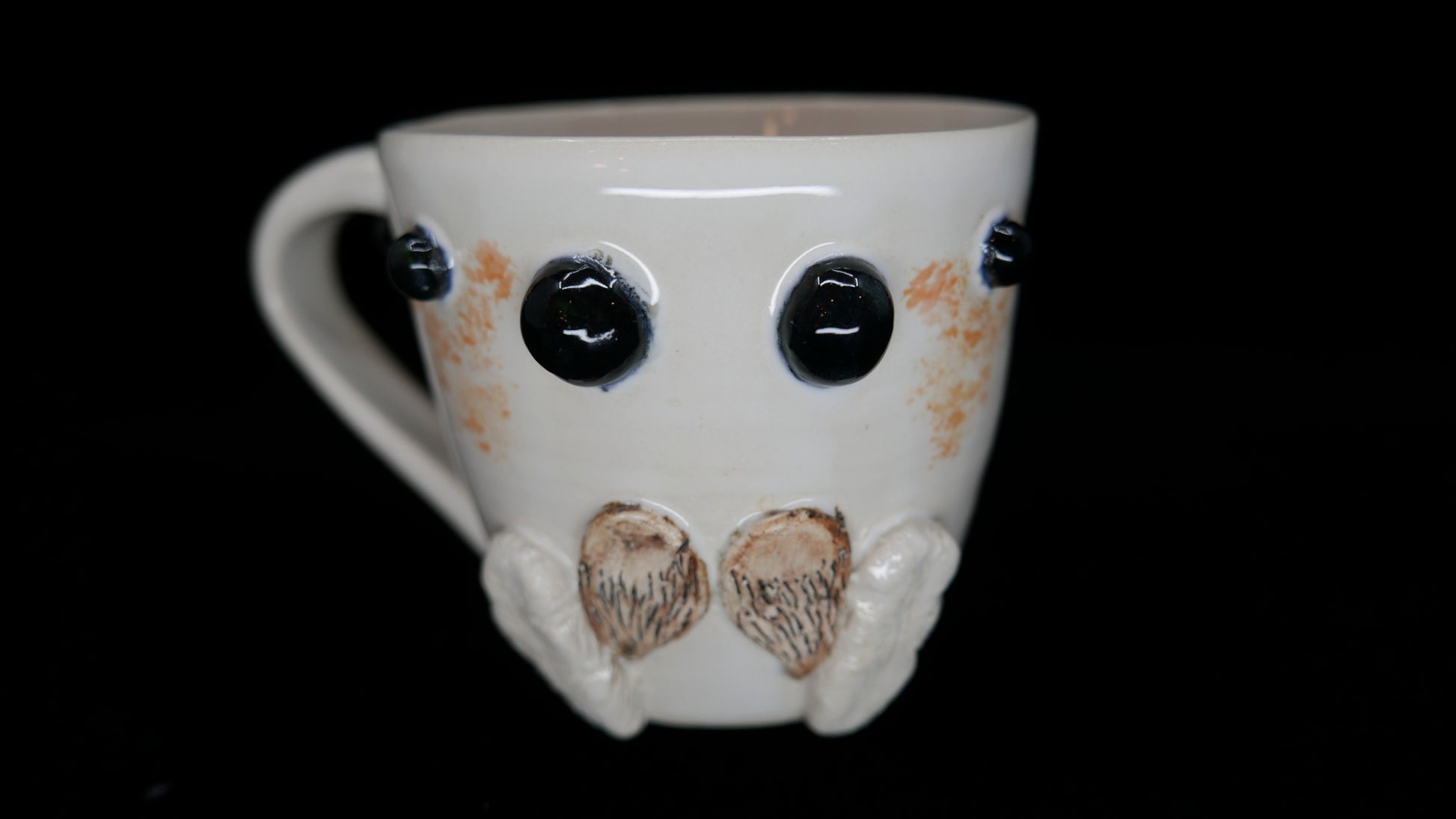 This mug is being sold as a "seconds" (discount) because I managed to miss the last set of eyes! He only has six!
